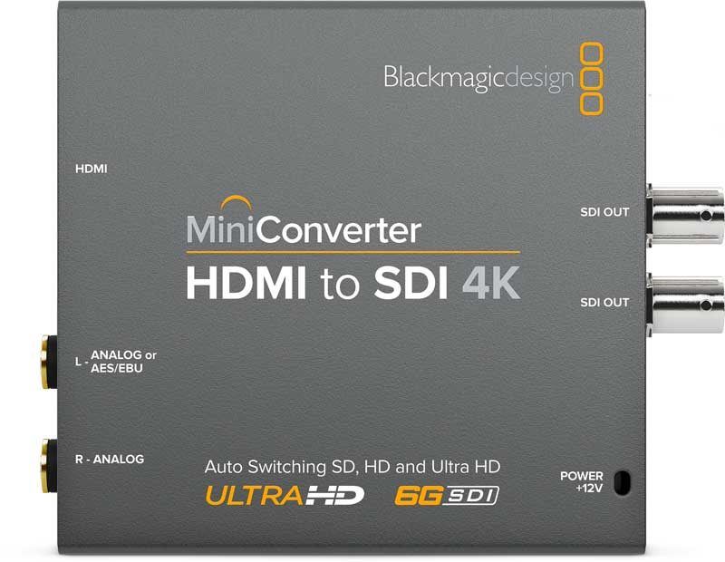Mini Converter HDMI to SDI 6G includes everything you need to convert from HDMI devices to SDI video in SD, HD and Ultra HD video formats. With independent audio connections you can also embed SDI audio from HDMI, AES/EBU or balanced analog audio inputs. Mini Converter HDMI to SDI 6G is the perfect solution to convert HDMI consumer cameras or computers to broadcast quality SDI.