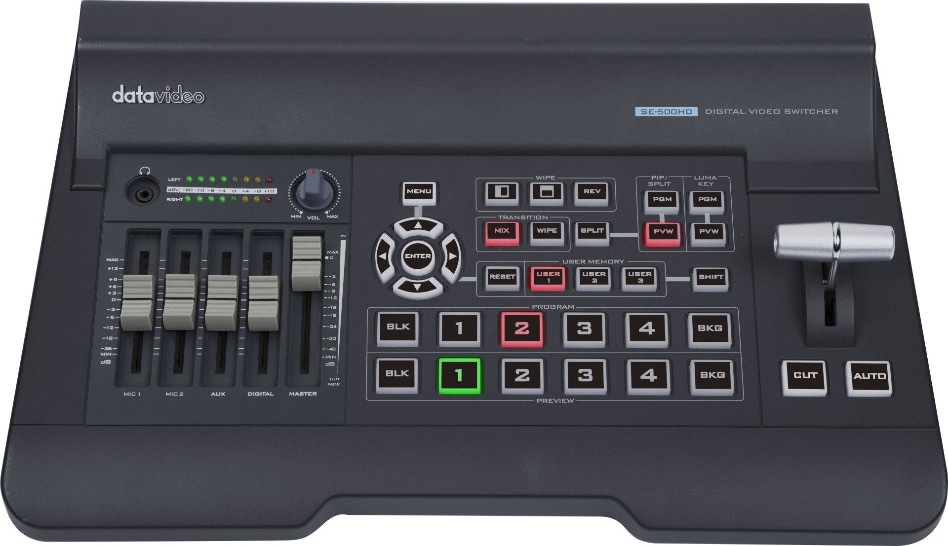 The DataVideo SE-500HD is a small, cost-effective, HD/SD digital video switcher with easy-to-use professional features. It offers 4 HDMI inputs and 2 HDMI outputs, supporting video formats up to Full HD 1080p.