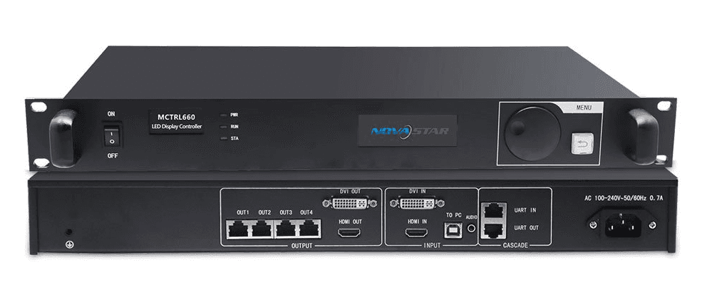 Novastar MCTRL660 is an independent controller and can output a maximum resolution of 1920x1200 @ 60Hz. Multiple controllers can be cascaded for uniform control. The MCTRL660 adopts an innovative architecture to implement smart screen configuration without using a computer, allowing a screen to be configured within 30 seconds. It also allows users to adjust screen brightness manually, which is faster and more convenient.